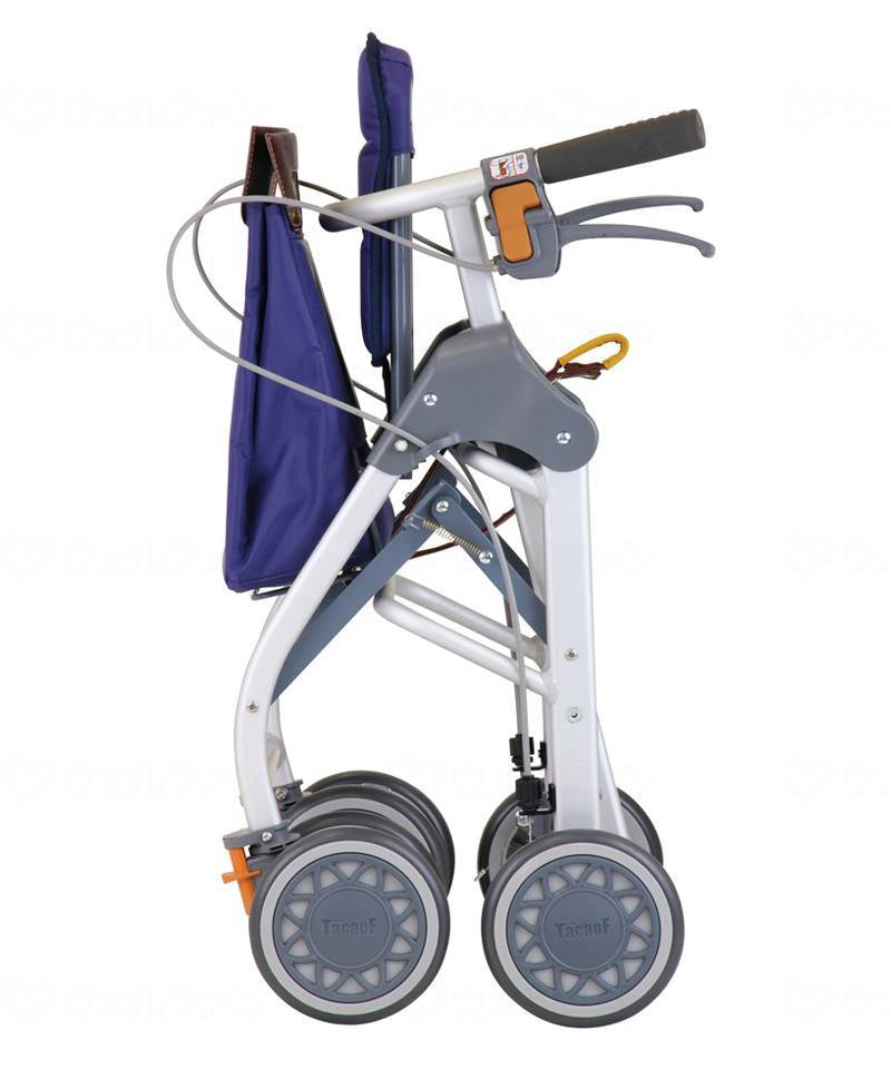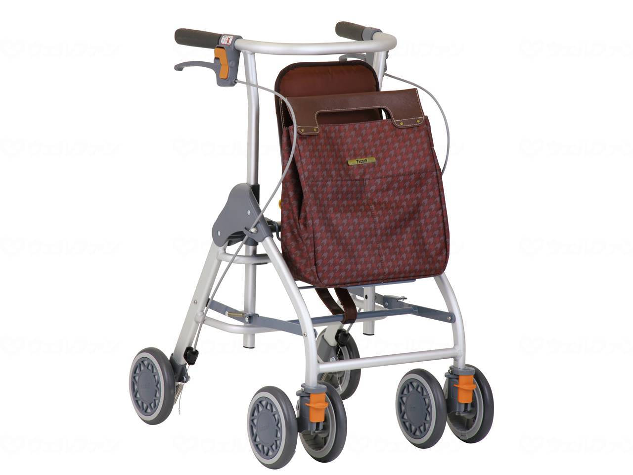 メーカー品番:「WAW04」 TAIS:「00030-000163」 コメント 小回りが利き、楽に使える!軽さが魅力のスリム設計。 コンパクト&簡単操作 本体幅47cmでコンパクト 小回りが利くので、狭い曲がり角や室内でも楽にお使いいただけます。 軽くて持ち運びに便利! 本体重量は約4.5kgと軽いので、段差での持ち上げや車への積み下ろしの際の負担も軽減。 幅広い高さ調節 押し手高さが幅広く調節できるので、背の高い方から低い方まで負担なくお使いいただけます。 折り畳み寸法:幅470×奥行350×高さ720mm 押し手高さ:640~910mm(10段階) 座面寸法:幅235×奥行250mm 座面高さ:480mm 袋寸法:幅300×奥行120×高さ340mm 車輪寸法:前輪/150Φ、後輪/150Φ 最大使用者体重:75kg 最大積載荷重:4kg 細い道や曲がり角などでもスイスイ移動できる快適な使い心地の歩行車です。 ■搭載機能 ピッチ押し手高さ調節(ワンタッチ) ボタン式手元ストッパー 1・2・3キャスター 折り畳み式 反射機能 本体の旋回性が高いので快適に扱える 車体の回転半径が66cmと小さく、小さい範囲で方向転換でき、小回りが利きます。 ※杖立てはオプションで取り付けいただけます。 アルミアルマイト仕上げ 材質・原材料 <材質> 本体/アルミ 座面/ナイロン 袋/ナイロン・ポリエステル 規格詳細 組立寸法:幅470×奥行580×高さ640~910mm 重量:約4.5kg