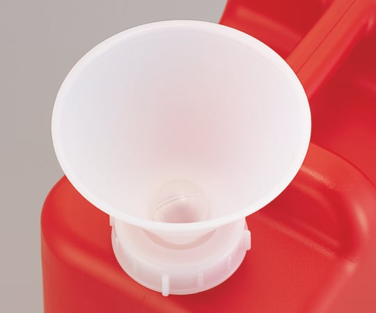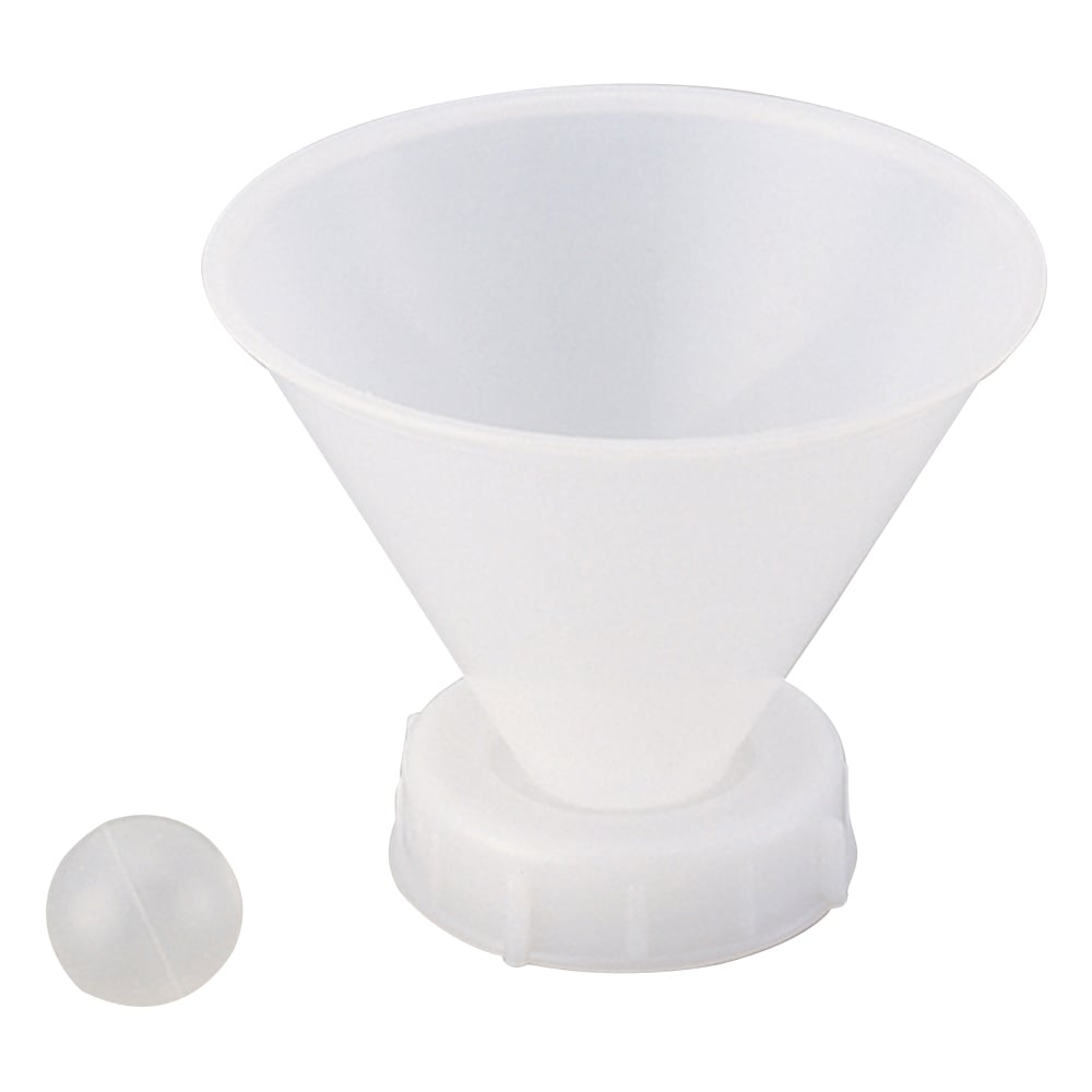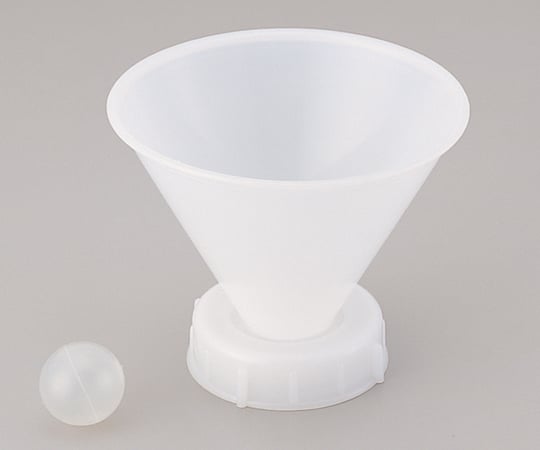 液体を流し込むと球が浮き、隙間からタンクへ液体が流れ込みます。材質:ロート/PE(ポリエチレン)、球/PP(ポリプロピレン)