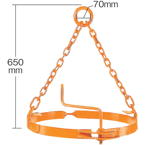 カタログ品番:300S 特長:●密閉ドラム缶専用です。●ワンタッチでドラム缶を固縛します。●標準ドラム缶(φ570mm)専用として開発されました。 用途:●ドラム缶吊り作業。(鋼製ドラム缶JIS Z1601用) 仕様:●基本使用荷重(t):1.0●寸法(mm)D:70●寸法(mm)H:650 注意:●変形したドラム缶には使用できません。●オープンドラム缶には使用できません。