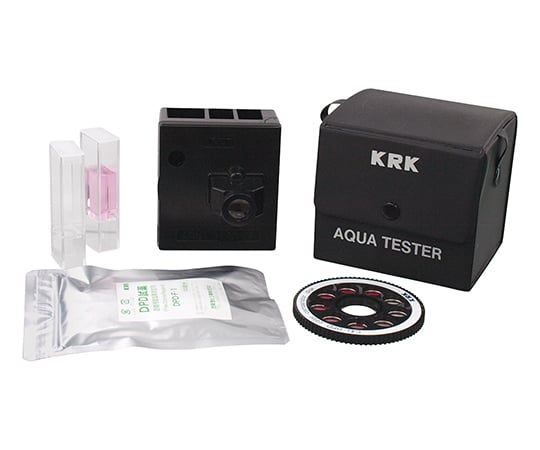 セット内容:比色測定器、DPD比色盤×1枚、角型比色管(フタ付き)×2本、DPD測定試薬(遊離残留塩素)×50回分、携帯ケース