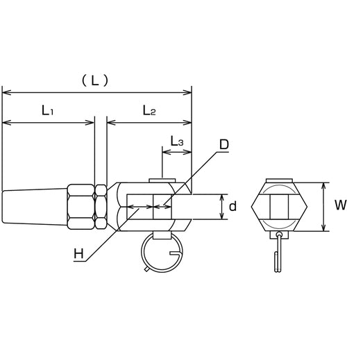 カタログ品番:B-2421 特長:●ワイヤを現場で取付できます。 用途:●ワイヤロープの端末に。 仕様:●適合ワイヤ径(mm):5●D(mm):8●W(mm):21●H(mm):11.2●L1(mm):38●L2(mm):34●L3(mm):10●d(mm):10.3●(L)(mm):79 材質/仕上:●ケーシング・ターミナル:ステンレス(SUS316)●二重リンク:ステンレス(SUS304)●爪:ステンレス(SUS420系クロームメッキ)●ゆるみ止めナット・座金:真鍮