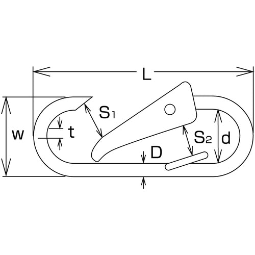 カタログ品番:A-103 特長:●ステンレス製で錆びにくく、耐久性に優れます。●ハズレ止め付で絡まりを防ぎます。 用途:●チェーン・ワイヤー・ロープなどの連結金具として、また端末の金具のジョイントに。 仕様:●使用荷重(kN):0.29●D(mm):7●L(mm):82●S1(mm):11●S2(mm):9●W(mm):31●d(mm):15●t(mm):5 材質/仕上:●ステンレス(SUS304)●仕上げ:バレル研磨仕上げ