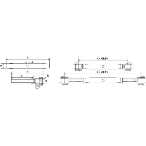 カタログ品番:B-1851 特長:●枠を回転させると、ゆるめたり締めたりすることができます。●枠式とは違い、パイプタイプでねじ部分が露出していないので、より装飾的です。 用途:●ワイヤロープの張り具合の調節に。 仕様:●使用荷重(kN):2.94●ねじ径:W3/8●L(mm):157●A(mm):77●W(mm):17●B(mm):123●d(mm):15●D(mm):12●L1(mm):230●H(mm):18●L2(mm):340●J(mm):8 材質/仕上:●ステンレス(SUS304)