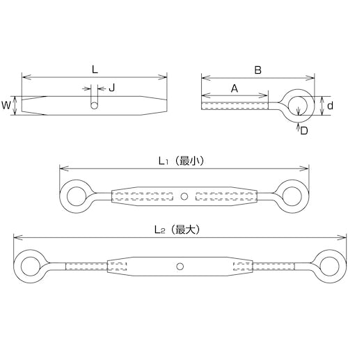 カタログ品番:B3054 特長:●枠を回転させると、ゆるめたり、締めたりすることができます。●枠式とは違い、パイプタイプでネジ部分が露出していないので、より装飾的です。 用途:●ワイヤーロープの張り具合の調節に。 仕様:●使用荷重(kN):0.88●ねじ径:M-4●L(mm):80●A(mm):40●W(mm):8●B(mm):65●d(mm):10●D(mm):3.5●L1(mm):130●L2(mm):195●J(mm):3 材質/仕上:●ステンレス(SUS304)