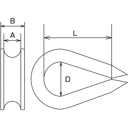 カタログ品番:B-1098 特長:●端末加工するワイヤーコースとして使います。●ワイヤーロープの先端をアイ加工して使用する場合、ワイヤーの摩耗を防ぎます。 用途:●ワイヤーロープの先端をアイ加工して使用する場合のワイヤの摩耗防止 仕様:●適合ロープ径(mm):3●A(mm):4.5●B(mm):6●D(mm):9.5●L(mm):18●使用ロープ径(mm):3 材質/仕上:●ステンレス(SUS304)