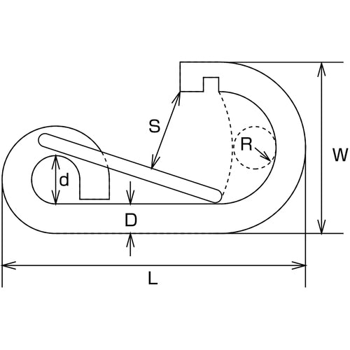 カタログ品番:B-136 特長:●フック部とチェーン・ロープを入れる部分が分かれています。 用途:●チェーン・ワイヤー・ロープ等の連結金具として、また端末の金具のジョイントに。 仕様:●使用荷重(kN):1.96●D(mm):12●L(mm):120●S(mm):23●W(mm):63●R(mm):11.5●d(mm):18 材質/仕上:●ステンレス(SUS304)