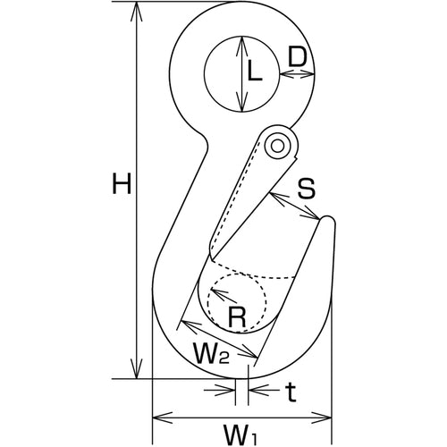 カタログ品番:B-2152 特長:●重量フックと比べて小さいフックです。●ハズレ止め付です。 用途:●ワイヤーロープなどの端末金具として。 仕様:●基本使用荷重(t):0.12●H(mm):99●L(mm):19.5●S(mm):17●W1(mm):47●W2(mm):22●D(mm):9●R(mm):7●t(mm):9.8●使用荷重(kN):1.18 材質/仕上:●ステンレス(SUS304)