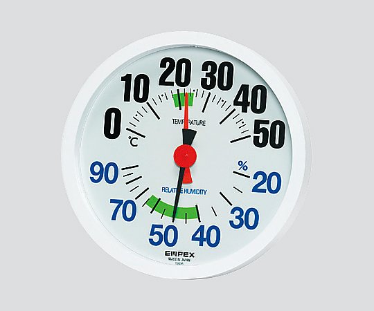 大きな文字で数字も針もはっきり見る事ができます。 屋内用の壁掛けタイプです。最小目盛:温度/2℃、湿度/5%RH 精度:温度/±1℃(-20~+40℃)・±2℃(その他)、湿度/±3%(35~75%RH・常温時)・±5%(その他) 材質:本体/PS樹脂、カバー/ガラス サイズ:約φ140×29mm 重量:約160g 測定範囲(温度/湿度):0~50℃/20~90%RH LUCIDO 型番:TM-2671