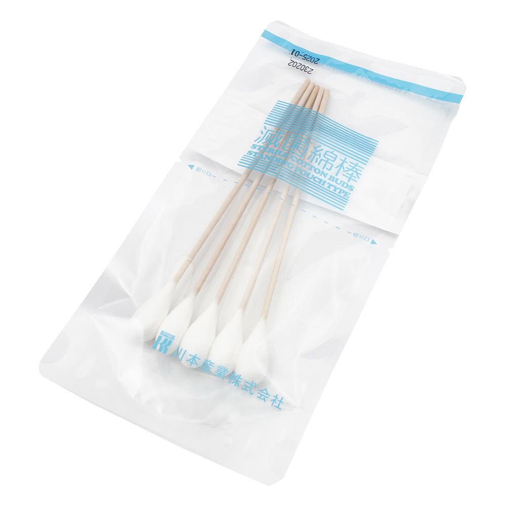 液剤を注いで容器として使えるバッグ入滅菌済綿棒です。 スタンドパウチは液剤の容器として使用でき、容器洗浄の手間が省けます。#104(5本/袋) 綿体部直径×長さ(mm):φ12×約19.5 入数:70袋/箱 電子線滅菌済 サイズ:長さ150mm片綿付 ※クリーンパックはされておりません。