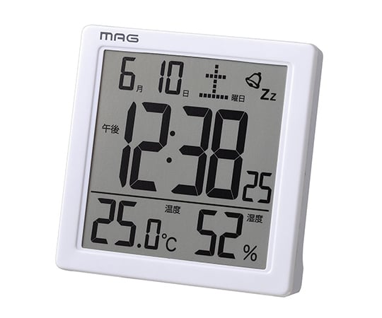機能:カレンダー表示(アラーム時刻表示切替)、温度表示、湿度表示、12/24時間表示切替、電子音アラーム、スヌーズ機能、タッチセンサー式ライト