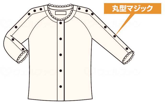 ボタンをかける手間を全面解消。テープを丸型にカットするなど、デザイン面も配慮しました。