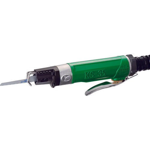 カタログ品番:KS-35 特長:●レギュレーター内蔵の強力・低振動タイプです。●無段階ストローク長調整機構付です(5mm、10mm切替)。●自動車のフレームやピラーの切り継ぎにも使えるハイパワー仕様です。●ヤスリを取付可能です。●消音排気ホースにより、粉じんの飛散を防止します。 用途:●自動車整備・板金の切断作業に。●アルミ・プラスチック・木材などあらゆる切断作業に。●穴あけ後のバリ取りや面取りなどのヤスリがけ作業に。 仕様:●切断能力(mm):鉄板3.2●ストローク長(mm):L時:10S時:5●ストローク数(回/分):6000●空気消費量([[M3]]/min):0.19●ホース取付口:Rc1/4●排気:後方●全長(mm):228●ストローク長(mm)ロング時:10●ストローク長(mm)ショート時:5●ストローク数(回/分)ロング時:5300●ストローク数(回/分)ショート時:6000●使用エアホース内径(mm):6.5●使用空気圧力(MPa)統合:0.6●使用空気圧(MPa):0.6●使用空気圧力:0.6MPa●騒音レベル(dB(A)):67●使用コンプレッサー(kW):2.2●使用エアホース(mm):6.5 セット内容/付属品:●カップリングプラグ20PM●6角棒スパナ3mm●ソーブレード32山