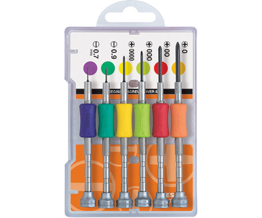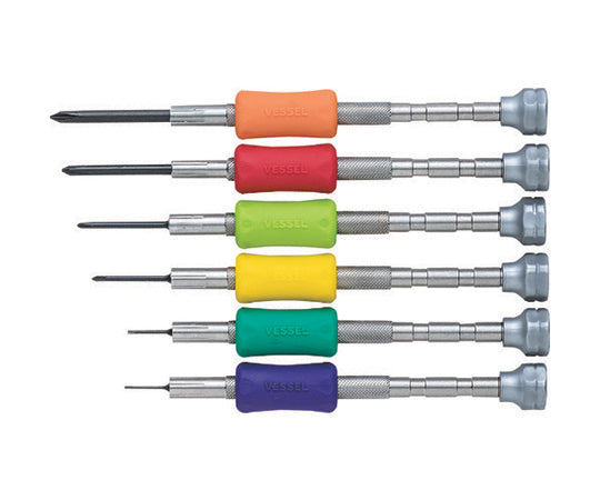 超極小ネジ用の精密ドライバーが入ったセットです。 指に優しく、調整作業で使いやすいクッショングリップで、樹脂のグリップを使いやすい位置にスライドできます。 早回しに便利な回転キャップ&ローレット加工です。 錆びにくいステンレス製です。 スマートフォン等の精密機器のメンテナンスに。セット内容:(-)0.7、0.9、(+)0、00、000、0000 セット内容(本):6 セット内容(点):6 ハンドルサイズ(mm):80 全長(mm):(+)0…106、(+)00…104、(+)000…100、(+)0000…97、(+)0.9…90、(+)0.7…90 刃先:(+)0、(+)00、(+)000、(+)0000、(+)0.9、(+)0.7 軸長(mm):(+)0…26、(+)00…24、(+)000…20、(+)0000…17、(+)0.9…10、(+)0.7…10 材質/仕上:本体/ステンレス鋼、ポリプロピレン、軸/特殊合金鋼、クッショングリップ/エラストマー セット内容/付属品:(+)0、(+)00、(+)000、(+)0000、(+)0.9、(+)0.7 注意:作業時は、保護メガネを着用してください。 注意:正しい用途・サイズ・使い方を確かめてご使用ください。 注意:電気作業ではショート事故・感電にご注意ください。 注意:過負荷はネジの破損やけがの原因となります。 注意:家庭ではお子様に注意して保管してください。 原産国:日本 コード番号:125-6689