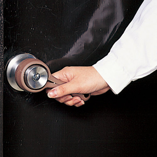 カタログ品番:342040 特長:●ドアノブ(握玉)の上から装着するだけで、ドアの開閉に便利なレバーハンドルタイプに切り替えることができます。●ゴム製なので安全です。 用途:●ドアノブをレバーハンドルに。 仕様:●色:ブラウン●全長(mm):155●幅(mm):60●厚さ(mm):30●適合ドアノブ径(mm):48〜58 材質/仕上:●基材:合成ゴム セット内容/付属品:●ビス●ワッシャー