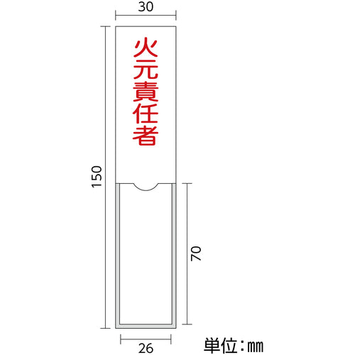 カタログ品番:046100 特長:●付属の札に対象者の氏名を記入し掲示するための標識です。●裏面に粘着テープが付いています。 用途:●責任者等の明示に。 仕様:●表示内容:火元責任者●取付仕様:粘着シール●縦(mm):150●横(mm):30●厚さ(mm):1●取付方法:貼付タイプ(裏テープ付き)●差し込み式●裏テープ付 材質/仕上:●基材:硬質塩化ビニール●粘着剤:アクリル系 セット内容/付属品:●白無地札
