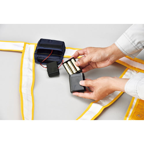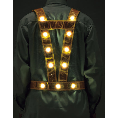 カタログ品番:238025 特長:●360度視認可能な腰部を含む計22個のLEDが、夜間の安全性を格段に高めます。●ウエストは面ファスナーによるフレキシブルなサイズ調整が可能です。 用途:●交通整理や現場作業時の安全確保に。 仕様:●色:黄地/金反射●着丈(cm):50●胴周り(cm):90〜120●サイズ:フリー●幅(cm):45〜60●表示内容:無地●反射帯幅(mm):50●LED色:白●LED×22個(前後各11個)●切り替え:点滅→点灯→消灯(ループ)●連続使用時間(h):点滅時約40時間(アルカリ電池使用)●使用電源:単3乾電池×3本(別売) 材質/仕上:●本体:PVC●反射帯:PVC 注意:●乾電池は付属していません。