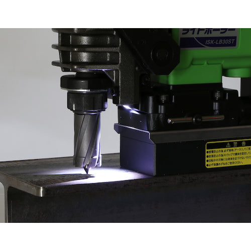 カタログ品番:ISK-LB30ST 特長:●工具を使わずに刃物交換可能で作業効率を更に高めました。●パワフルモーターを搭載し、コンパクトで超軽量だが、力強い穴あけを実現しました。●独立した高輝度LEDを搭載し、暗所でもポンチ・刃先・センターピンが見やすいです。●スイングヘッド付でマグネット固定後も穴あけ位置の微調整が可能です(左右40mm・前後20mm可動)。●専用ノス型ドリルを使えば穴径8mmから加工可能です。 仕様:●穴あけ最大能力(mm):30●最大板厚(mm):35●ストローク(mm):49●電源(V):100●電源コード長さ(m):3●最小板厚(mm):6●マグネット寸法(mm):192×70●無負荷回転数(min[[の−1乗]]):790●最大磁力(N):5.5●電圧(V):100●穴あけ能力(mm):8〜30●消費電力(W):850 セット内容/付属品:●キャリングケース●安全固定ストラップ●センターピン(ISK-LB30ST:CP-35S1深さ6〜21mm用、ISK-LB50ST:CP-50S1深さ6〜50mm用)●スプレー式切削油(ISK-LB30STのみ)、水溶性切削油(ISK-LB50STのみ)