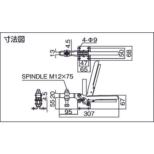 カタログ品番:KC-41C 特長:●開放レバー付です。 仕様:●全長(mm):307●締圧力(kN):3.5●付属ボルト径:M12×75●製品刻印:No.41C●下方押え型●ハンドル横型●フランジベース 材質/仕上:●スチール(SPCC) 注意:●表記の締圧力は目安です。●締圧力はクランプアームの先端は行くほど弱くなります。●衝撃や振動内圧は、破損の原因になりますのでご注意ください。●手を挟まないように注意してください。