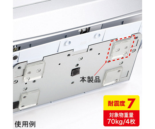 無色透明なスチレン系エラストマー素材の耐震ゴムで、キレイに地震対策。 中型。 無色透明な耐震ゴムで、設置後も目立ちません。 使用する機器の底に貼り付けるだけの簡単設置です。 ゆっくりはがせばクリアに元通り、汚れた場合は水で洗うことで、繰り返し使用可能です。 人と地球にやさしいスチレン系エラストマー素材を使用しています。 <ご使用方法> 1.設置面の汚れを十分に取ってください。 2.設置機器に当製品のビニールを剥がして貼ります。この際、耐震性は当製品と接している面積が大きい程、高くなります。 3.耐震性は単純に機器の重量だけでなく、形状・重心・設置面の素材(設置面の素材により粘着力が変わる為)等により決まりますので、耐震性を高める為には出来るだけ設置面の広い面積で当製品をお使いください。 4.設置したい場所に置き、ゆっくり押さえつけます。 5.剥がす際は、端をつまみゆっくり剥がしてください。剥がしずらい場合は、隙間に少しずつ水をつけながら剥がすと、楽に剥がせます。耐震度:7 対象物 重量:70kg以下/4枚 適応温度:-30℃~+80℃ サイズ:W40×D40×H5mm 素材:スチレン系エラストマー 製品寿命:約5年(使用環境によって異なります)<注意事項> ※当製品は地震や衝撃による破損を少なくするものであり、災害や事故等を補償するものではありません。 ※漆塗りやニス塗り等、デリケートな設置面へのご使用を避けてください。 ※当製品は両面テープではありませんので、壁面に固定したり、物を吊り下げたりしないでください。 ※当製品は子供の手の届かない所で保管してください。 ※当製品は食べられません。 ※PPやテフロン加工された面など、一般の粘着テープにつきずらい面には粘着しません。 ※直射日光のあたらない室内でご使用ください。 ※使用環境によっても異なりますが、5年を目安に交換することをお奨めします。