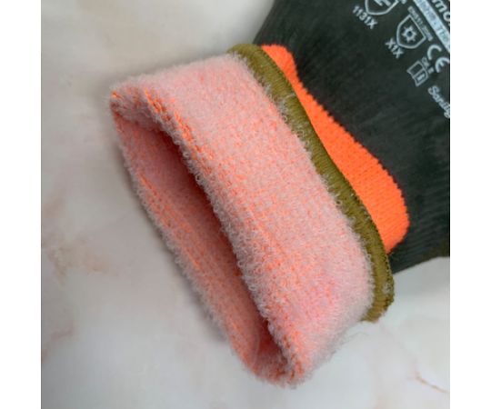 裏地をパイル編みし、起毛させた防寒作業用手袋です。色:オレンジ/ダークブラウン