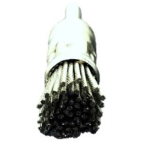 カタログ品番:EA-015 特長:●ホイール・カップ・ベベル型で処理できない狭い箇所に最適です。●コーナー部やL字型箇所の錆落し、溶接後のスケール除去に使用されます。●硬鋼線を亜鉛メッキしてヨリ加工をした毛材です。●強力な研削力と耐折損性に優れています。 用途:●各種金属製品の錆、汚れの除去●溶接処理前後のクリーニング●造船・橋梁等のタンク及びドラムのクリーニング、塗料剥離●アングルコーナー部や穴底、側壁のバリ取り、磨き、クリーニング●ネジ穴のクリーニング●溶接ビートや頑固なバリ除去 仕様:●線径(mm):0.3●毛材:BRH-0.3 亜鉛メッキより線●外径(mm):15●毛丈(mm):15●軸長(mm):25●軸径(mm):6●最高使用回転数(rpm):3000●毛の色:シルバー●筒径φ15x筒長25x軸径φ6x軸長25x毛丈15 材質/仕上:●BRH-0.3 亜鉛メッキより線(Φ1.2) 注意:●軸はブラシの根元まで差し込み、しっかりとチャッキングできたことを必ず確認して下さい。●軍手等にフィラメント(線材)がからみ、手首ごと機械工具に巻き込まれる危険がありますので、軍手等を用いての使用はおやめください。●研磨対象部品を手に持って作業すると、作業対象物がブラシの回転力に負けて飛散し、大きな事故につながります。●研磨対象部品は必ず固定器具に装着のうえ、作業を行ってください。
