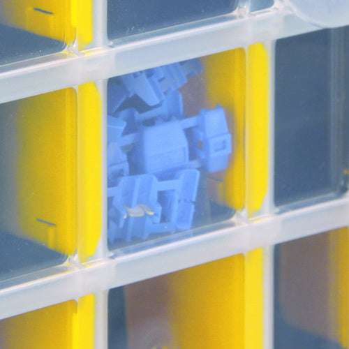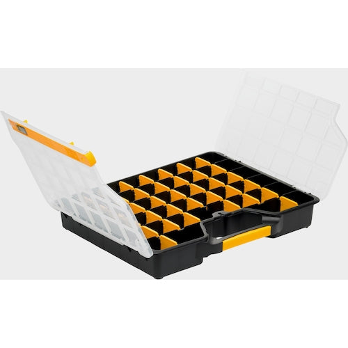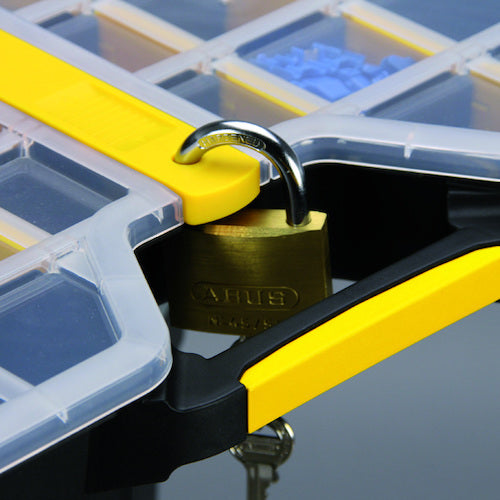 カタログ品番:457430 特長:●スライダーロックでフタはしっかりと固定され、中に入っているものは仕切りから動きません。●ハンドル付きで持ち運びに便利です。●黄色の仕切板は取り外し可能です。 用途:●部品・パーツなど小物の収納、持ち運びに。 仕様:●色:ブラック/イエロー●外形寸法(mm)間口:465●外形寸法(mm)奥行:375●外形寸法(mm)高さ:72●有効内寸(mm)間口:460●有効内寸(mm)奥行:365●有効内寸(mm)高さ:62●南京錠(別売):取付可●仕切板(枚):36●耐荷重(kg):10●南京錠取付穴径:7mm 材質/仕上:●ポリプロピレン(PP)