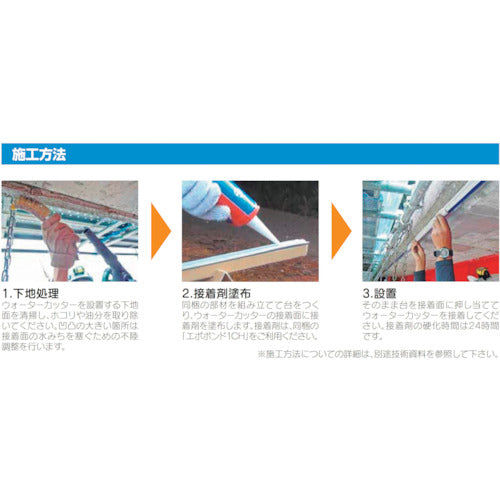 カタログ品番:WATC 特長:●1本僅か80gで取付が簡単です。●コンクリート構造物用の水切り材です。●独自の形状で伝い水を効果的にカットします。●組立式取付台が同梱されています。●1液接着剤でラクラク施工が可能です。 用途:●橋梁壁高欄下部の水切りに。●構造物庇下部の水切りに。 仕様:●幅(mm):1040●高さ(mm):65●奥行(mm):220●NETIS登録番号:KK-180012-VE 材質/仕上:●エチレンプロピレンゴム(EPDM) セット内容/付属品:●ウォーターカッター20本●エポボンド1CH(接着剤)3本●専用取付台2組 注意:●接着面のホコリや油分等は取り除いて下さい。●製品は直射日光を避け、屋内に保管して下さい。●製品使用時には、製品添付の取扱説明書を確認して下さい。●下地の凹凸が大きい場合、凹凸の隙間が水みちとなるため不陸調整が必要です。●不陸調整を行う場合、別途エポボンド1CHの追加分が必要となります。