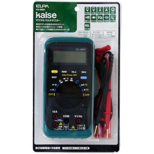 カタログ品番:KU-2600 特長:●レンジホールド、偏差測定機能付きです。●データホールド機能付きです。●電池の消耗を防ぐオートパワーオフ機能付きです。●テストリード固定機能付ホルスターを装備しています。●見やすい大型表示で、4000カウントできます。●作業性抜群傾斜スタンドです。 仕様:●直流電圧(V):0.4/4/40/400/600●交流電圧(V):0.4/4/40/400/600●直流電流(A):0.04/0.4/10●交流電流(A):0.04/0.4/10●抵抗(Ω):400/4K/40K/400K/4M/40M●抵抗:400Ω/4/40/400KΩ/4/40MΩ●直流/交流電圧:400mV/4/40/400/600V●静電容量:0.1ηF〜200μF●電源:単3形乾電池×2本(テスト用付属)●【測定方法】●直流/交流電圧:400mV/4/40/400/600V●抵抗:400Ω/4/40/400KΩ/4/40MΩ)●直流/交流電流:40/400mA/10A●導通試験:約50Ω以下でブザー●ダイオードテスト●静電容量:0.1ηF〜200μF●周波数/デューティー比(Hz/%):周波数9.999Hz〜9.999MHz●付属品:テストリード&ホルスター、単三形乾電池2本(テスト用内蔵)、スペア電池2本(テスト用)、スペアヒューズ0.5A/250V、10A/2