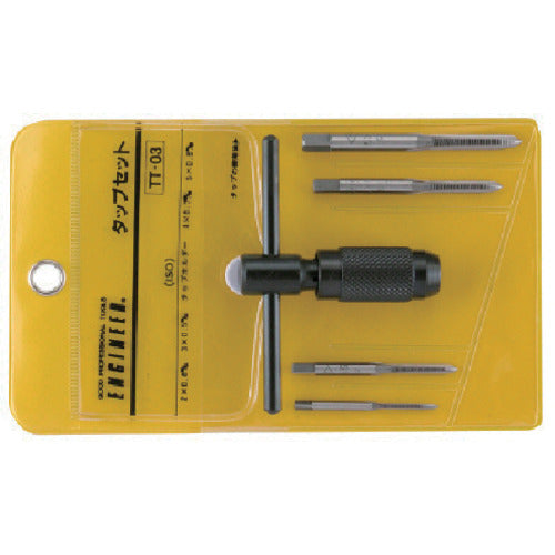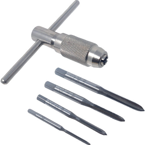 カタログ品番:TT-03 特長:●T型ハンドルと4種タップがついたセットです。 用途:●一般止まり穴加工用。 仕様:●先端:中●呼び寸法:M2、3、4、5●ピッチ(mm):0.4、0.5、0.7、0.8●セット内容:中タップ4本(M2、3、4、5)、タップハンドル●セット点数:5 セット内容/付属品:●中タップ4本(M2、3、4、5)、タップハンドル