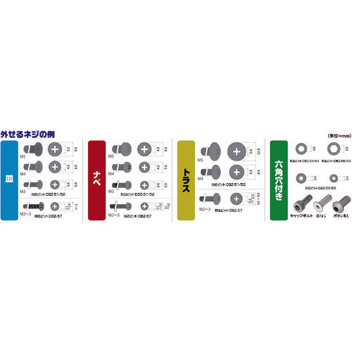 カタログ品番:DBZ-55B 特長:●回せなくなった皿ねじやキャップボルトなどを緩めることができるビット交換式ドライバーです。●DBZ-51は、プラスねじの潰れ方が軽症な場合に、叩くことなく緩めることができ、重症な場合はDBZ-52を使い、叩いて緩めることができます。●DBZ-53は、六角穴付ねじの潰れ方が重症な場合でも、叩いて緩める事ができます。●軽症用ビットは潰れたねじを叩かずに外せます。●重症用ビットは潰れたねじをハンマーで叩いて外せます。●エルゴノミクスデザインを採用したグリップで、ビットの性能を最大限に引き出します。 用途:●潰れたプラスネジや六角穴付きボルトの取り外しに。●現場での修理、整備、自動車、バイク、自転車のメンテナンス、日曜大工に。 仕様:●セット内容:DBZ-51、52、53、DBZ-50B●セット内容(点):4●ビット全長:共通105mm●ビット軸長:共通60mm●グリップサイズ:L107×W60×H32mm 材質/仕上:●グリップ:ABS樹脂、ナイロン●ビット:炭素鋼、エラストマー セット内容/付属品:●軽症用ビット:DBZ-51●重症用ビット:DBZ-52、53●グリップ:DBZ-50B