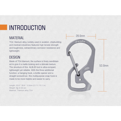 カタログ品番:ALB20 特長:●カラビナ、マイナスドライバー、栓抜き機能付きのマルチツールです。●FENIX製ライト用オプションです。 仕様:●幅(mm):28.6●奥行(mm):53.8●高さ(mm):3.5●適合機種:FENIX製ヘッドライト●全長(mm):69●品名:マルチキー 注意:●電球交換できません。●LEDは決して直視しないでください。