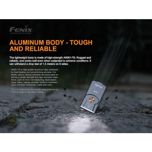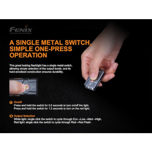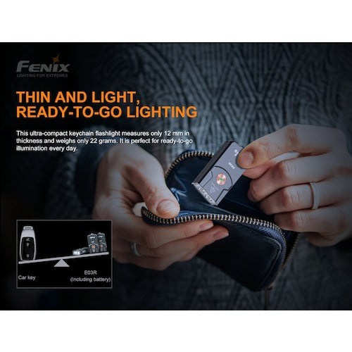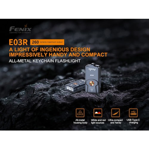 カタログ品番:E03R 特長:●小さくて絶妙なオールメタルのキーチェーンランプです。 仕様:●明るさ(lm):260●色:黒●外径(mm):24●全長(mm):47●電源(V):200mAhリチウムポリマーバッテリーx1●最大点灯時間(h):18●保護等級:IP66●幅(mm):24●奥行(mm):47●高さ(mm):12●照射距離(m):42●電源:200mAhリチウムポリマーバッテリーx1●全光束(lm):750●横(mm):24●最大点灯時間:約18時間(5lm時)●最大照射距離:42m(260lm時)●保護等級:IP66●電源:専用充電池(内蔵) セット内容/付属品:●USBType-C充電ケーブル●キーリング●製品マニュアル●保証書 注意:●電球交換できません。●LEDは決して直視しないでください。