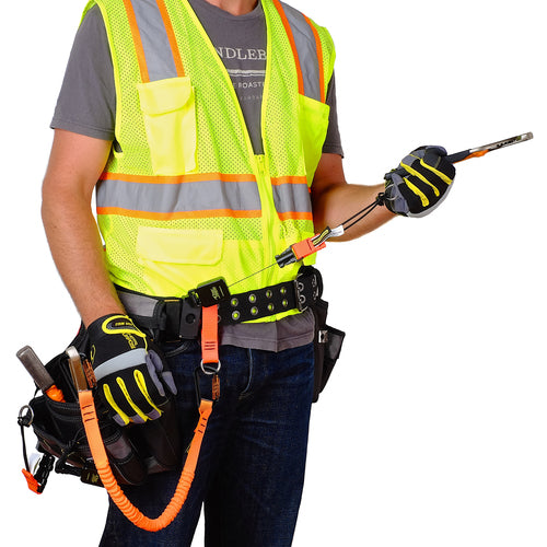 カタログ品番:TL13041 特長:●ANSI/ISEA 121-2018 準拠品です。●ベルトや落下防止用のハーネスに取り付けられます。●工具を使用の際はどの方向にも回転します。 用途:●高所作業など、工具の落下防止に。 仕様:●最大長さ(mm):1220●色:オレンジ●長さ(mm):680●径(mm):19●最大使用荷重(kg):6.8●ANSI/ISEA 121-2018準拠●両端アルミカラビナ付 材質/仕上:●カラビナ:アルミニウム