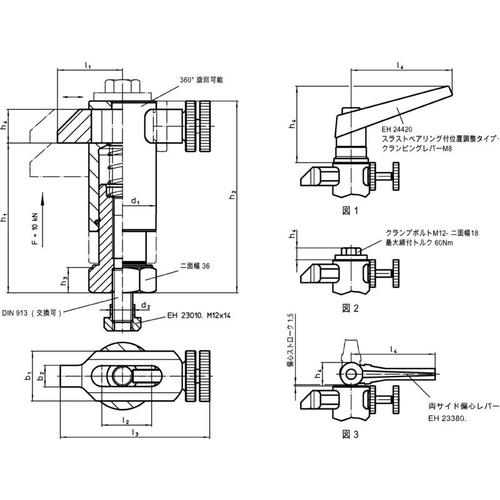 カタログ品番:23310.0083 特長:●ボルトやクランプレバーを使って素早く手締めでクランプすることができます。●クランプ・アームを旋回させればワークの交換が容易にできます。●コンパクトなので狭いスペースでクランプできます。●高さ調整シリンダーなどを使って必要なクランプ高さに対応できます。●クランプ・アームを前後に動かすことにより、より早く、簡単にワークを交換できます。●クランプアームの長さを調節することができます。●旋回方向・角度:左右360°です。 用途:●機械加工におけるワークの固定に。 仕様:●高さ(mm):Max 197●アーム長さ範囲(mm):38-55●クランプ力(N):6000●旋回方向・角度:左右360°●ストローク(mm):20●Tスロットボルト:M12●タイプ:クランプレバー●ストローク(mm):20 材質/仕上:●焼入れ鋼、浸炭焼入れ、黒染、研磨
