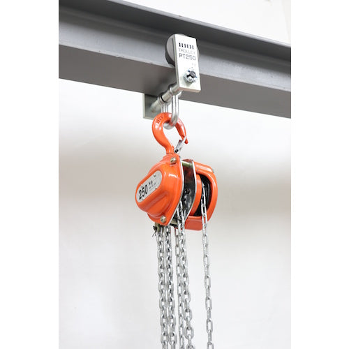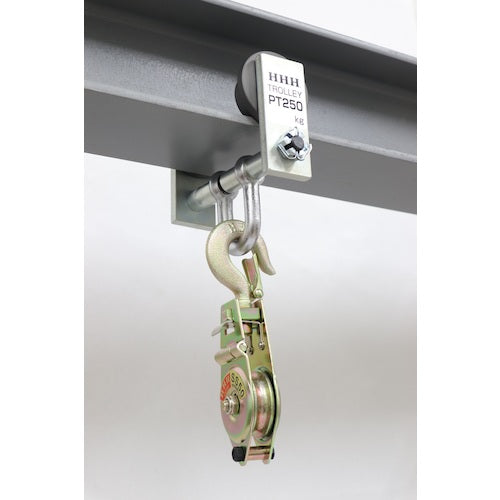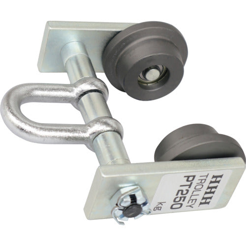 カタログ品番:PT250 特長:●小型軽量ですので一人で設置できます。●分離しなくても仮組の状態で設置できます。●二輪なので小回りが利きます。●小型、安価なので工場の生産ラインや倉庫などの省力化にも最適です。 用途:●ホイストなどの横移動に。 仕様:●定格荷重(t):0.25●最小回転半径(mm):500●適合レール幅(mm):75〜100●2輪 材質/仕上:●スチール