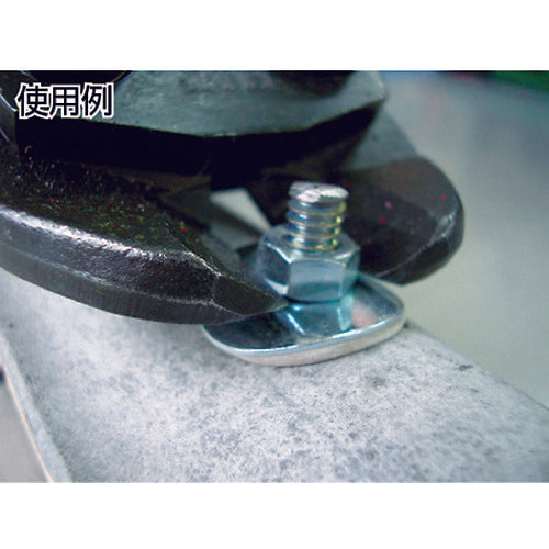 カタログ品番:MN350G 特長:●狭いすき間に刃が入るため、根元からカットできます。●ナットの下に刃が入るため、フックボルトの撤去、リベットの撤去などに最適です。 用途:●ナットの下に刃が入るため、フックボルトの撤去、リベットの撤去などに最適です。 仕様:●全長(mm):450●切断能力(mm)HRB80軟線:φ7以下●切断能力(mm)HRC20硬線:φ5以下●適合替刃:MNC350G 材質/仕上:●ハンドル部:スチール●刃部:特殊鋼●グリップ部:天然ゴム 注意:●切断時は必ず刃の真ん中より奥にて切断してください。