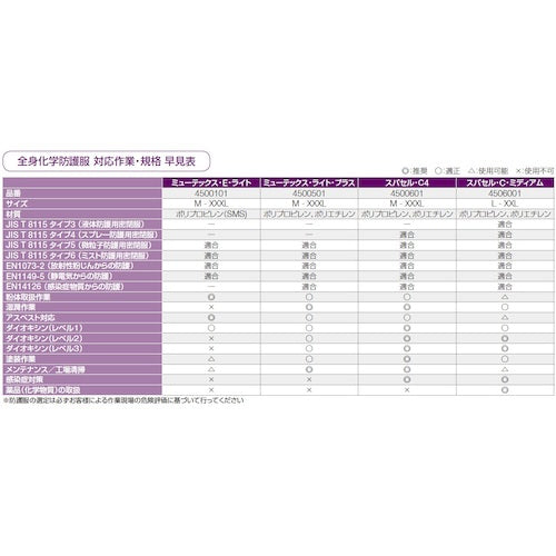 カタログ品番:4500101-L 特長:●透湿度の高いSMS製防護服です。●頭部にフィットする立体的な構造のフードです。●袖口や足首、ウエストゴムの締まりが粉じんの付着を軽減します。 用途:●医療関連、製薬業用。●粉じん、粉体作業用。●アスベスト除去などに。 仕様:●色:白●サイズ:L●適合身長(cm):176〜182●適合胸囲(cm):100〜108●タイプ:つなぎ服●使い捨てタイプ●JIS T 8115規格タイプ5〜6適合品(微粒子・ミスト防護用)●EN1149-1(静電気からの防護)●脱着が容易な2ウェイジップ●静電気防止 材質/仕上:●ポリプロピレン(SMS)