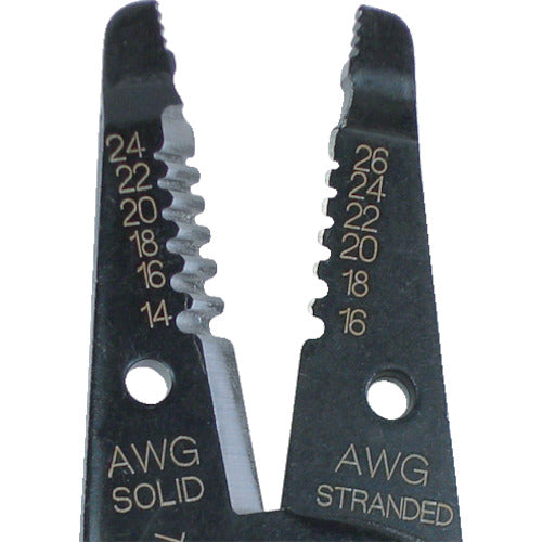 カタログ品番:45-121 特長:●グリップは手になじみやすいエンボスデザインです。●レオパードスポット(滑り止め加工)で正確なストリップをサポートします。●保管に便利なフックホール付です。●簡易スケール(20mmまでのスケールをミリとインチで表記)付です。 用途:●ゴム系電線、ビニール系電線、一般電線に。 仕様:●全長(mm):160●適合電線(mm):0.5〜1.6単線 0.4〜1.2より線●適合電線([[MM2]]):0.2〜2.0単線 0.13〜1.25より線●適合電線(AWG):14〜24単線、16〜26より線●適合電線:単線AWG14〜24、より線AWG16〜26●色:黄色 材質/仕上:●スチール