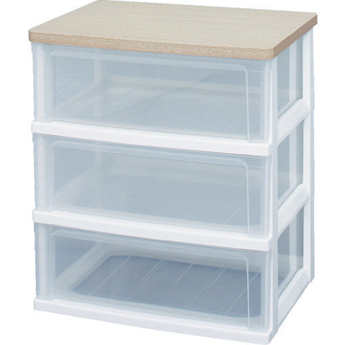 カタログ品番:WTW-543-FO 特長:●中身が見えるワイドチェストです。●引き出しにはストッパーが付いており、落下を防ぎます。●着脱簡単フレームなので引き出しの増減が可能です。●前後方向への移動がスムーズに出来るローラーが付いています。 仕様:●引出し数:3●間口(mm):556●奥行(mm):410●高さ(mm):623●天板色:フレンチオーク●収納目安:Yシャツなら8枚、セーターなら4枚、バスタオルなら4枚●引出し内寸(mm)間口×奥行×高さ:485×353×166●引出し:3●天板耐荷重(kg):10●耐荷重:4kg/段 材質/仕上:●天板:プリント紙化粧パーティクルボード●本体・引き出し:ポリプロピレン(PP)●ローラー:ポリアセタール(POM)