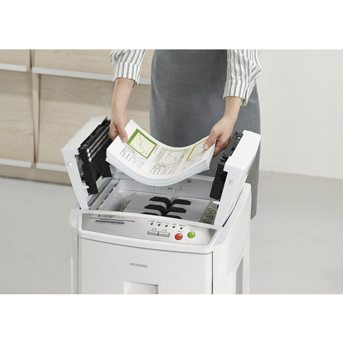 カタログ品番:AFS160HM 特長:●オートフィード機能だからフタを開けて紙をセットするだけで自動細断可能です。●1回で160枚の紙を細断できます。●2×10mmのマイクロクロスカットタイプで、個人情報をしっかり保護、細断クズがかさばらずゴミ捨ての負担も軽減します。●キャスター付きで移動も楽に行えます。 仕様:●細断最大枚数(枚)(50/60Hz):160(自動)6(手差し)●メディア細断:◯●幅(mm):430●奥行(mm):352●高さ(mm):710●電源(V):単相100●消費電力(W):145(50Hz)/150(60Hz)●電源コード長さ(m):約2●定格使用時間(分):20(自動)10(手差し)●投入口寸法(mm)幅:218●カットサイズ(mm):2×10●ダストボックス容量(L):39●細断速度:約1.6m/min(50Hz) 1.9m/min(60Hz)●色:ホワイト●最大細断サイズ:A4●タイプ:マイクロクロスカット●消費電力(50/60Hz):145/150W●定格使用時間:手差し10分、自動細断20分●細断速度(50/60Hz):1.6/1.9m/min●安全装置:ダストボックススイッチ、過熱保護のサーマルプロテクター、温度ヒューズ●投入口幅:218mm(用紙)、123mm(メディア)●カットサイズ:約2×10mm(マイクロクロスカット) 材質/仕上:●ABS樹脂●AS樹脂●POM●ポリプロピレン、スチール