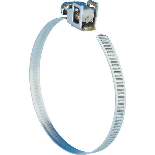 カタログ品番:CAS050MS 特長:●ハウジングに干渉せずにバンドを通せるため、仮止めが素早く行えます。●頭上のダクトやパイプの締結作業で作業効率が向上します。●狭い場所での脱着作業も簡単にできます。●バンドのスリットが非貫通のため、結束物を傷つけにくいです。●ハウジングをつまみ上げることで解除でき、取り外しも簡単に行えます。 用途:●一般産業、農業、空調設備、電気設備用。 仕様:●最大径(mm):50●最小径(mm):35●バンド幅(mm):11●厚さ(mm):0.82●締付トルク(N・m):3.4-4.5●6角ボルト(mm):7●締付け工具:六角(7.0mm)、マイナスドライバー●塩水噴霧試験(NSS):240時間 材質/仕上:●スチール(亜鉛コート処理)