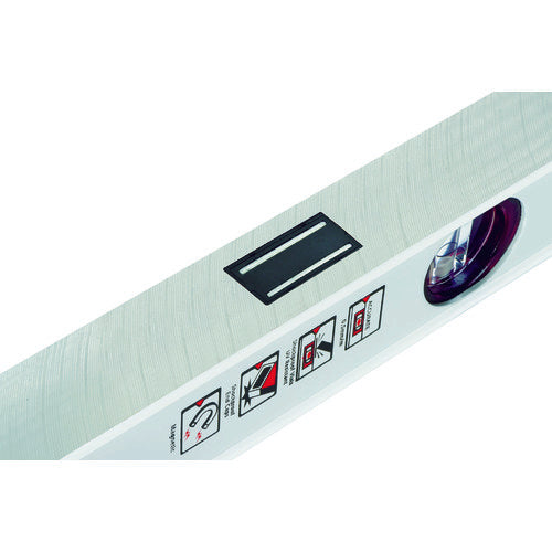 カタログ品番:KP905212007PM0 特長:●赤色水平気泡管は、気泡が確実に目盛りの間に位置し、強光と弱光環境において最高の視覚効果を発揮します。●水平気泡管内のレベリングラインは1%と2%の勾配測定用です。●独自のDual-Viewシステム搭載で、垂直と水平は同じ平面で観測できます。●耐衝撃のサイドプロテクター付です。●磁石付で鉄骨工事の測定に便利です。●三面から見える水平気泡管は、観察しやすく、気泡管の保護に役立ちます。 用途:●水平・垂直測定用。 仕様:●色:ホワイト●長さ(mm):1200●高さ(mm):68●厚さ(mm):35●マグネット:3ヵ所●精度:精度:0.5mm/m=0.0286°●測定方式:気泡管の目盛線の中央に気泡がくる様にして測定してください 材質/仕上:●本体:アルミニウム●気泡管:アクリル樹脂(PMMA)
