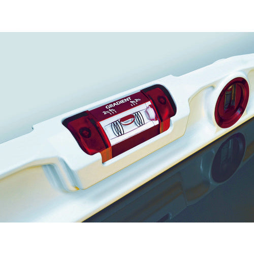カタログ品番:KP930206007000 特長:●赤色水平気泡管は、気泡が確実に目盛りの間に位置して、暗い場所でも最高の視覚効果を発揮します。●耐久性に優れるアクリル防振気泡管2個付きです。●緩衝ラバーパッドと端面保護カバー付き、効果的に衝撃を和らげ、気泡管の精度を確保します。●底面圧延仕上げです。 用途:●水平・垂直測定用。 仕様:●色:ホワイト●長さ(mm):600●高さ(mm):55●厚さ(mm):27●マグネット:なし●精度:精度:0.5mm/m=0.0286°●測定方式:気泡管の目盛線の中央に気泡がくる様にして測定してください 材質/仕上:●本体:アルミダイカスト●気泡管:アクリル樹脂(PMMA)