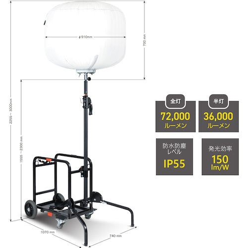カタログ品番:BL-500-FD 特長:●不整地でも使いやすい4段階調整ができる補助脚がついています。●全灯・半灯の2段階調光が可能です。●発電機を収納したまま移動できます。●バルーンタイプなので全方位をドライバーや作業者に「眩しくない優しい光」で明るく照らします。●瞬時に点灯するので、緊急時などでも役立ちます。●LEDのため省エネ・長寿命 発電機での使用時間も従来に比べ、ぐんと伸びております●用途に合わせた高さの調整が可能です。●紫外線量が蛍光灯の200分の1で、赤外線もほぼ出ず虫が寄りにくいです。●LEDの部分はユニット式となっており、万が一破損した場合でも、個別に交換が可能です。●従来のメタルハライドランプに比べ、低発熱・低電力・高寿命です。 用途:●工事用照明、道路交通の明かりに、非常用備蓄品に。●自治体のお祭り、イベント用照明に。●花火大会など各種会場に。●神社仏閣の沿道などに。●臨時駐車場などに。 仕様:●明るさ(lm):72000●幅(mm):1070●奥行(mm):740●高さ(mm):2225〜3000●コード長さ(m):8●消費電力(W):490●電源(V):AC100●本体寸法(mm)幅:1070●本体寸法(mm)奥行:740●本体寸法(mm)高さ:2225〜3000●電源(V)(50/60Hz):AC100●発光効率(lm/W):150●電線仕様:3芯ポッキンプラグ●タイプ:全光中型台車●定格寿命(時間):50000●バルーン直径(mm):910●バルーン最大高(mm):3000●照射角(°):360●色温度(K):5000●電源コード長さ(m):8●保護等級:IP55●電圧(V):100〜240●本体寸法(mm)幅×奥行×高さ:1070×740×2225〜3000●照射範囲:360°●保護等級:IP55●明るさ:72000lm(全灯) /36000lm(半灯)●球寿命:約50000時間●電線種:VCTコード×3芯 防水プラグ付●コード長さ:8m●消費電力:432W(全灯) /216W(半灯)●発電機(別売)搭載可能 セット内容/付属品:●灯具用バック×1●灯具用バッグ