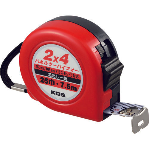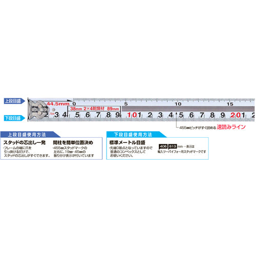 カタログ品番:PS2575BBP 特長:●フレームの端に爪を引っ掛けるだけで、スタッドの芯出しがすぐできます。●ツーバイフォー工事でパネリング・フレーミング作業の必需品です。 用途:●パネリング、フレーミング作業 仕様:●テープ幅(mm):25●長さ(m):7.5●455mmマークの左右に38mmスタッド両端表示、45mm振り分け表示が付いています。「柱の巾一発」●上段目盛(スタッドの芯出し一発、間柱を簡単位置決め)●下段目盛(標準メートル目盛、先端0基点)●4点鋲●ショックアブソーバー付●ベルトクリップ付 材質/仕上:●テープ:スチール●バネ:スチール●ケース:ABS樹脂