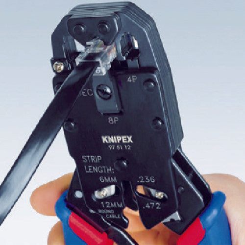 カタログ品番:9751-12 特長:●平行に力を加えますので確実に圧着できます。●長さ6mmおよび12mm切断用のカッターとケーブル分解用ナイフを装備しています。 用途:●電話用リボンケーブルの切断とストリッピング(皮むき)用に。●RJ10(幅7.65mm)タイプとRJ11/12(幅9.65mm)タイプ、RJ45(幅11.68mm)タイプの6ピンおよび8ピンウエスタンプラグの圧着に。 仕様:●全長(mm):200●圧着端子(mm):RJ10(4ピン)7.65、RJ11/12(6ピン)9.65、RJ45(8ピン)11.68