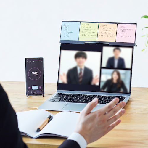 カタログ品番:A251-24 特長:●ノートPCの上部に設置して要点をチェック!Web面接で。●Web会議で。●TO DOリストに。●カメラを隠さずふせんが貼れる。●75×75mm ふせん4枚貼り付け可能。●ボード面の十字を目印に、きれいに並べられます。●ノートPCの内蔵カメラを隠さない形状で、PC上部にふせんを貼るスペースを確保。 用途:●カメラ目線のまま要点をチェックできるふせんボード 仕様:●色:ブラック●縦(mm):168●横(mm):168●パック入数:1●推奨対応ノートPC ディスプレイ厚:12mm以下 サイズ:13インチ以上 材質/仕上:●ABS樹脂 注意:●推奨対応ノートPC ディスプレイ厚:12mm以下 サイズ:13インチ以上