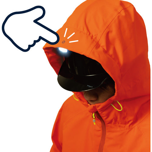 カタログ品番:AS82047 特長:●フード先端のスイッチを押すとライトが点灯します。●表面に防水加工を施した止水ファスナーです。●手差しポケットは水が入りにくい構造です。●背面に視認性を高める反射プリントを施しています。●表生地は伸縮性、弾力性があり動きをサポートします。●裏にはべたつきにくく、袖を通しやすいメッシュ素材を使用しています。●縫目の裏側は防水テープ加工で水の浸入を防止します。●リサイクル生地を使用しています。 用途:●雨具 仕様:●色:ブルー●サイズ:EL●身長(cm):175〜185●胸囲(cm):102〜110●耐水圧:10000mm[[H2O]]●着丈(cm):78●適合身長(cm):175〜185●胸幅(cm):122●頭周り(cm):31●明るさ:最大約48ルーメン●連続点灯時間:約15時間●照射距離:約50m●電源:単4乾電池×2本(ご使用環境、電池の種類、消耗具合により変動します。)●透湿性:10000g/[[M2]]-24h 材質/仕上:●表:ポリエステル100%(熱可塑性ポリウレタンラミネート)●裏:ポリエステル100%