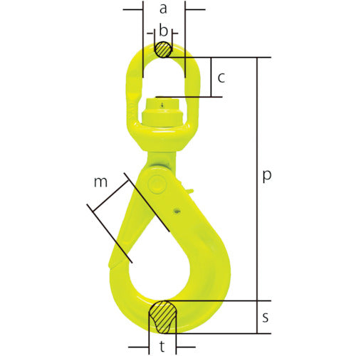 カタログ品番:BKLK-7/8-10 特長:●ボールベアリングスイベル付のロッキングフックです。●荷重のかかった状態でもスムーズな回転が得られます。 用途:●建築・土木・生産工場での吊り作業用。 仕様:●基本使用荷重(t):2.0●適合チェーン線径(mm):8●寸法(mm)P:183●寸法(mm)m:37●寸法(mm)p:183●寸法(mm)s:25●寸法(mm)t:17●寸法(mm) b:12●寸法(mm) a:38●寸法(mm) c:27●ベアリングスイベルフック BKLK−6 材質/仕上:●特殊合金鋼