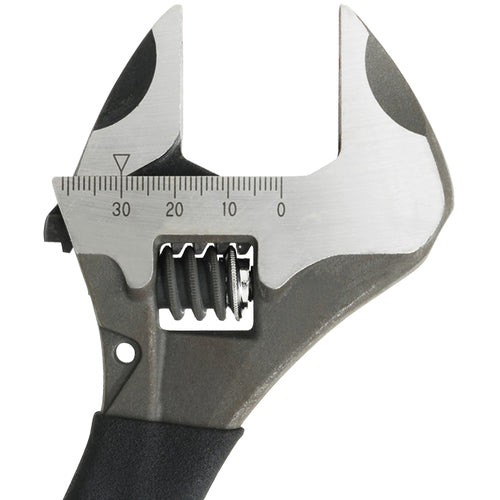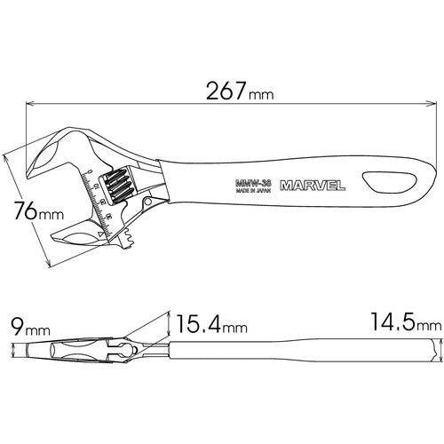 カタログ品番:MMW-38 特長:●ガタつきがないのでボルト・ナットを傷付けず、スパナ並みの強度を実現しました。●ワンサイズ上の高精度な口開きで目盛付です。●滑りにくいグリップ付きハンドルは握りやすく、手が痛くなりにくく力を入れやすくなってます。 用途:●ボルト・ナット締め緩め作業等に。 仕様:●色:黒●全長(mm):267●最大口開き(mm):38●口開き(mm):0〜38●先端厚さ(mm):9●グリップ有無:有●ポリ塩化ビニルグリップ付き●目盛付き 材質/仕上:●本体:クロムバナジウム鋼●グリップ:ポリ塩化ビニル